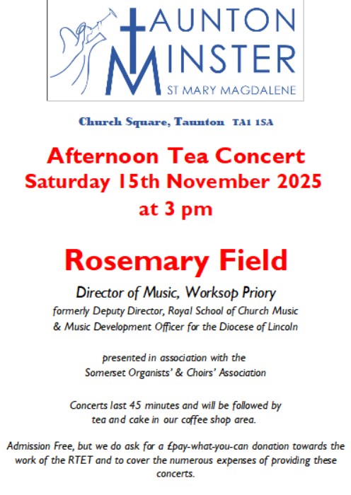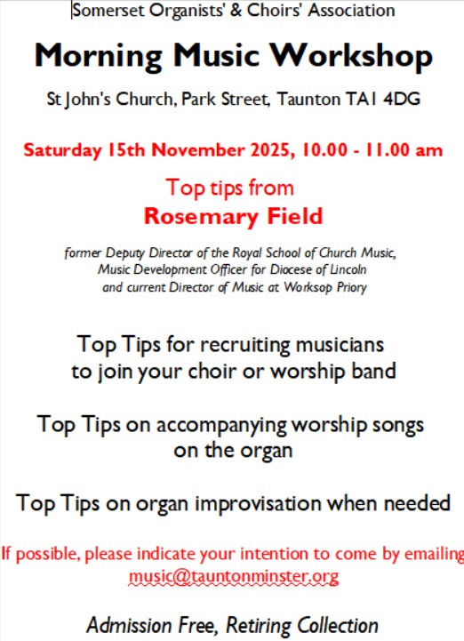 Our Calendar for 2025 Annual General MeetingSaturday 15th November 2025 Featuring the traditional lunch and Rosemary Field, who will be leading a musical workshop in the morning and providing an organ recital in Taunton Minster in the afternoon. Like Loading...